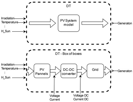 In Figure 6, there is a comparison between the original concept of DT, where there is a unique model of the system to predict the whole system, and the proposed concept of a “box of boxes”, where it has the same inputs and outputs but also has other intermediate variables that provide more information about the twin system.