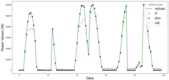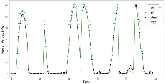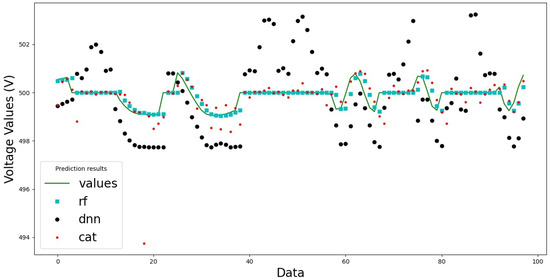 In Figure 12, the situation is completely different, because the voltage values only range from 499 V to 501 V, and most are clustered above 500 V. ML models have difficulty predicting these stable movements. As shown in the graph, DNN usually makes predictions above or below the true value, while CatBoost was unable to accurately predict the upper and lower values, and the average remained around 500 V, so the graph shows that RF predicted with the best accuracy.