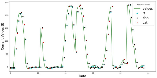 Comparison between the actual current values of the DC–DC part with the predictions made by ML models.