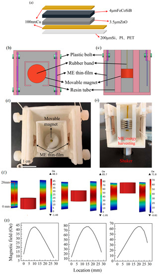 The double cantilevered ME thin-film module is designed and fabricated with flexible substrate and Si substrate. The frame of the ME module was fabricated by 3D printing using resin with a bottom area of 45 × 45 mm2 and a height of 50 mm. A pair of ME thin-film laminates were clamped with a plastic bolt at the top of the frame on two sides of the resin tube, shown in Figure 1b,c. The NdFeB permanent magnet with the size of Φ18 mm × 3 mm was hung by a rubber band in the resin tube to keep it moving vertically and provide an alternative magnetic field to the ME devices under mechanical vibration excitation by the shaker. The fabricated ME module is shown in Figure 1d,e. The permanent magnet is vertically movable, and the magnetic field to ME devices changes during the vertical motion of the magnet. The permanent magnet NdFeB N35 is provided by Shanxi Dajinhua Magnetic Co., Ltd., and the residual flux density Br is 1.25T. Due to the symmetric configuration, two ME devices are expected to have similar ME coupling performance. For the purpose of improving the efficiency of energy harvesting, quadrangular, hexagonal, and octagonal shapes of the 3D-printed frame can be designed in the future, which means four, six, and eight ME thin-film laminates can be fastened at the top. However, we only used two laminates to present the feasibility, which is enough to prove efficiency. We use COMSOL package to simulate the magnetic field applied to the ME laminate as shown in Figure 1f,g. For the magnetic field, no current interface is used with the magnetic flux conservation condition. The simulation is carried out by the steady-state analysis with a physics-controlled mesh of normal size. The results show that at three different vertical locations of the magnet, the magnitudes of the magnetic field applied to the laminate are different, with the middle location of the magnet presenting the maximum field and the lower limit position displaying the minimum field to the ME laminate. The peak values for the three cases are about 43 Oe, 78 Oe, and 65 Oe, respectively.