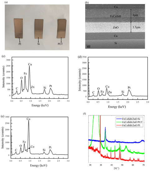 Characterization of ME thin-film: (a) fabricated specimens. (b) SEM figure of the fabricated specimen on Si substrate. EDS results of (c) Cu layer, (d) ZnO layer, (e) FeCoSiB layer, and (f) XRD result.