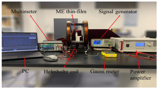 An experiment test platform was built for the performance test of FeCoSiB/ZnO thin-film generators as shown in Figure 4. The AC magnetic field was generated by the Helmholtz coil driven by the signal generator (Tektronix AFG 1022) that is connected to the power amplifier (Aigtek ATA-3080). The ME thin-film generator was clamped and placed in the middle of the coil as so to guarantee a uniform magnetic field applied to the ME device, and the probe of the Gauss meter was fixed as close as possible to the ME thin-film generator to measure the magnetic field accurately. To measure the voltage and power output of the ME device, a multimeter (Keithley DMM-7510) was used and connected to a laptop to demonstrate the time history of output signals. The internal resistance of the multimeter is 10 MΩ when measuring the output voltage, which is much larger than the resistance of the device. With this testing system, we measured the voltage output, current output, and power output with different amplitudes and frequencies of the magnetic field. The ME performance of magnetoelectric composites can be evaluated by the magnetoelectric coupling coefficient as αme = V/(dH) [44], where V is the voltage difference between the upper and lower surface of the piezoelectric layer measured by the multimeter, d is the thickness of the piezoelectric layer, and H is the magnitude of the applied magnetic field.