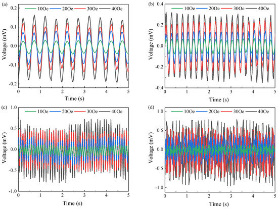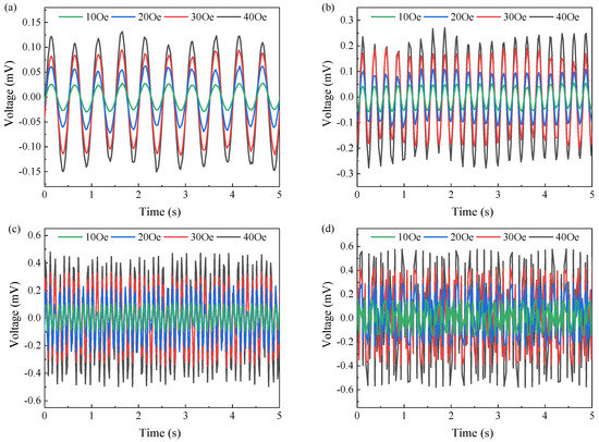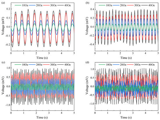 The effect of magnitude and frequency of the driving magnetic field on the voltage output of ME laminate on PI substrate: (a) 2 Hz, (b) 4 Hz, (c) 10 Hz, and (d) 20 Hz.