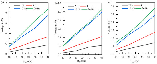 Effect of the magnitude of driving magnetic field on the coupling voltage output with different frequencies: (a) PI, (b) PET, and (c) Si.