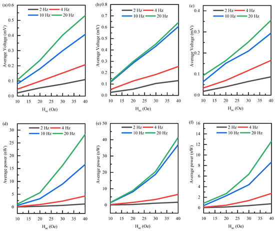 Output of average voltage and power for different substrates: (a) and (d) PI, (b) and (e) PET, (c) and (f) Si.