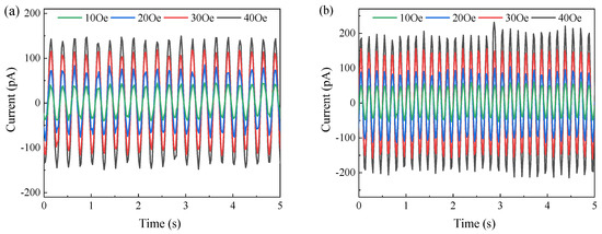 To further investigate the ME-coupling performance, we calculate the average voltage output and power for the above results. Since the current is supposed to be only several picoamperes by using the multimeter, the average power is calculated by using the internal resistance of the multimeter 10 MΩ and the average voltage output instead of measuring the current for power calculation. The results are shown in Figure 9 for the three substrates. The average voltage and power reflect that the harvested energy intensity is better than the peak value. The maximum average voltage outputs under 40 Oe magnetic field are 0.532 mV, 0.643 mV, and 0.355 mV for Pi, PET, and Si, respectively. In addition, the power outputs are 28.3 nW, 41.3 nW, and 12.6 nW for Pi, PET, and Si, respectively. The tendency of the curve changes with respect to the magnitude of the magnetic field and alternating frequency is similar to the curves of maximum value shown in Figure 8. However, the average output power increases dramatically when the frequency increases from 4 Hz to 10 Hz. We further calculate the ME-coupling coefficients by using the average voltage output, which is 266 mV/(cm·Oe), 321.5 mV/(cm·Oe), and 177.5 mV/(cm·Oe) for Pi, PET, and Si, respectively. The current outputs are also measured with the multimeter internal resistance of 1 kΩ, which can be regarded as the load resistance. It should be noted that the resistance of the multimeter is automatically adjusted based on the measurement range. The current outputs under four frequencies and four amplitudes of the magnetic field are given in Figure 10, Figure 11 and Figure 12 for the three substrates. For the PI substrate, the maximum current outputs are 149.1 pA, 207.5 pA, 234.0 pA, and 276.5 pA when the exciting frequencies are 2 Hz, 4 Hz, 10 Hz, and 20 Hz, respectively. The average current outputs are shown in Figure 13, which demonstrates that the current output performance of PET is also better than those of PI and Si substrates. Thus, these results demonstrate that the single cantilevered ME laminate on PET substrate presents the best ME-coupling performance under low-frequency magnetic field excitation.