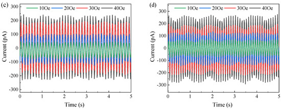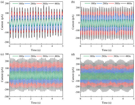 The effect of magnitude and frequency of the driving magnetic field on the current output of ME laminate on PI substrate: (a) 2 Hz, (b) 4 Hz, (c) 10 Hz, and (d) 20 Hz.