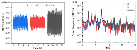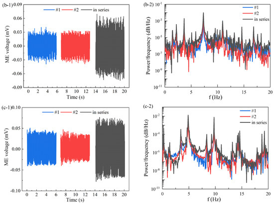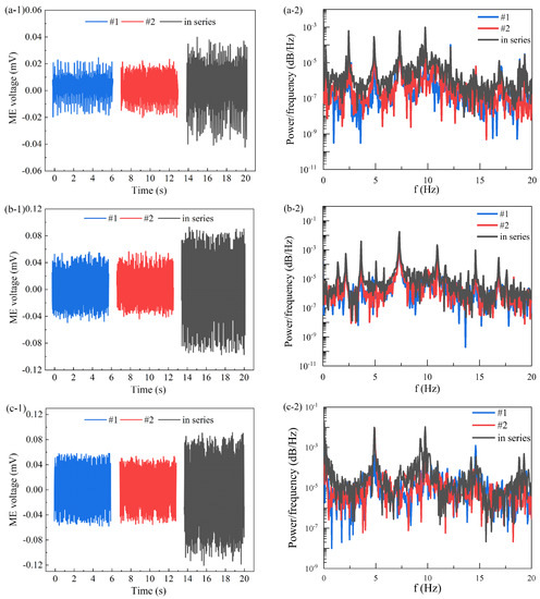 Voltage output and PSD of the voltage based on Si substrate for laminate 1 and 2 separately, and connected in series: (a-1) voltage and (a-2) its PSD under 2 Hz magnetic field, (b-1) voltage and (b-2) its PSD under 3 Hz magnetic field, and (c-1) voltage and (c-2) its PSD under 4 Hz magnetic field.