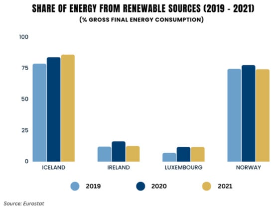 The availability of energy is essential for the economic development and prosperity of states. Global energy demand is increasing due to population growth and to the developing needs of emerging economies [,]. The current surge in fossil fuel prices is having an impact on most of the world’s economies, and raises the issue of energy security. The adoption of renewable energy can not only help in mitigating climate change, but can also enhance resilience to price volatility and reduce energy costs [,]. Many industries are responsible for high energy demand, with a significant contribution coming from the transportation sector. In fact, this sector’s consumption accounts for approximately 25% of the world’s energy use [], while the need for green and renewable energy sources has increased []. Moreover, the total global biofuel demand is expected to expand by 20% between 2022 and 2027 []. Another important source of global greenhouse gas emissions is the heat and electricity sector, as it was notably responsible for the largest increase in carbon dioxide (CO2) emissions in 2021 []. However, as in the transportation sector, the need for renewable and greener energy is now greater than ever, in order to meet energy demands while ensuring sustainability. It is hence worthwhile to note that such shifts have already begun; the share of energy coming from renewable sources in many European Union countries increased between 2004 and 2021, most notably in Iceland and Norway [] (Figure 1).