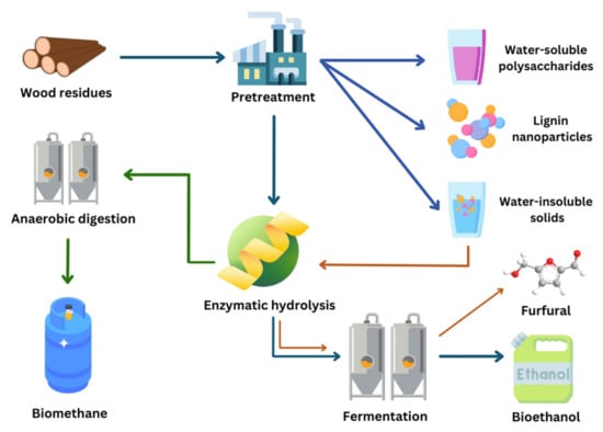 While wood LCBs are certainly promising for the production of bioethanol, there remains a possibility of valorizing them into value-added products. For instance, in the study led by Wan et al. [], the PHP PT not only allowed for the production of bioethanol, but also allowed the recovery of water-soluble polysaccharides and lignin nanoparticles. On the other hand, the classical process of bioconversion can be followed with a different final product. For example, Hashemi et al. [] pretreated birch wood with SE and performed EH, with the final purpose of producing biomethane. In another study, chemically treated birch wood resulted in water-insoluble solids, which in turn underwent EH and fermentation, separately, to finally produce furfural. The solid residue from EH was further fractionated for the product of lignin nanoparticles [].