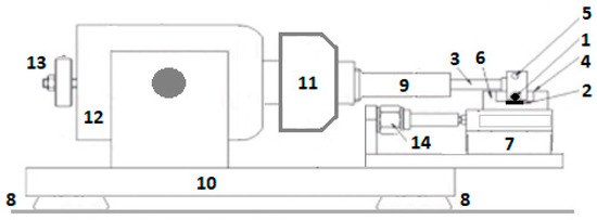 Schematic of the HFFR apparatus (own elaboration): 1—test ball, 2—test plate, 3—oscillating rod, 4—test fluid reservoir, 5—test mass, 6—heating bath, 7—support, 8—controllable base, 9—elastic lock, 10—main frame, 11—elastic connector housing, 12—electromagnetic vibrator, 13—counterweight, and 14—force transducer.