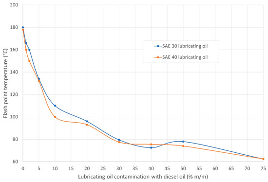 According to EN IEC 60079-10-1 [39], the flash point of a material is the lowest liquid temperature at which, under certain standardized conditions, a liquid emits vapors in a quantity that is capable of forming an ignitable vapor/air mixture. If the substance tested is the lubricating oil contaminated with the diesel oil in the amount of C (% m/m), the flash point temperature tFP can be provided as a function of the contamination of the lubricating oil with diesel fuel, and the auto-ignition temperature decreases with the increasing value of C [15].
