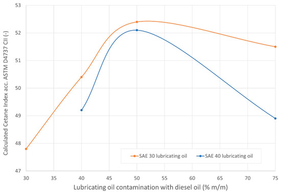 These studies also resulted in obtaining additional results regarding the ignition properties. Previously, the calculated cetane index (CCI) values were determined only for 50% contamination of the lubricating oil and for pure diesel oil. The additional research provided insight into the changes in the CCI parameter for the dilution of the lubricating oil with diesel oil above 30–40% m/m of diesel oil content in the mixture.