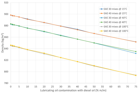 Density values of the tested mixtures of the lubricating oil and diesel oil as a function of the mass fraction of the diesel oil in the tested mixtures of the lubricating oil and diesel oil at measurement temperatures of 15 °C, 40 °C, and 100 °C.