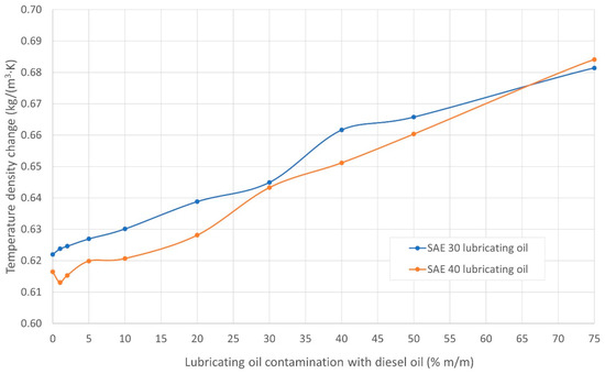 The values of the coefficient of temperature density change ε determined for the density at 15 °C and 100 °C of the tested mixtures of lubricating oil and diesel oil, as a function of the mass concentration of diesel oil in the mixture, are presented in Figure 6. The coefficient ε quantifies the decrease in the density of the mixture when heated by 1 °C. For both mixtures of the lubricating oils for the SAE 30 and SAE 40 grades, an increase in the value of the coefficient is observed in the range between 0.61 and 0.69 kg/(m3∙K) as a function of the rise in the content of the diesel oil in the mixture with the lubricating oil. The values of coefficient ε for both mixtures are similar, while the addition of 10% m/m of diesel oil in the mixture causes an increase of this factor by approximately 15% and for the addition of 30% m/m, this factor is escalated by approximately 38% compared to the pure lubricating oil (for SAE 30 or SAE 40).