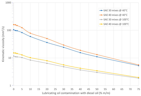 If the fuel in the oil worsens the wear conditions of the piston–piston rings-cylinder liner system due to thinning of the oil film, then fuel contamination may be the cause of engine seizure. Previous work [16] has indicated that when the diesel oil content in the lubricating oil exceeds 10%, an oil film rupture occurs, which can result in increased wear for the tribological couples, such as the bearings in the crank-slider system. At the same time, given the decrease in viscosity and, thus, the deterioration of the lubrication conditions and the reduction in the evaporation and ignition temperatures, one can conclude that the synergistic interaction of these factors increases the risk of explosion in the engine crankcase. Previous work [23] has presented a middle ground for the earlier-mentioned extreme opinions regarding the impact of diesel oil contamination on engine performance and, simultaneously, the obtained results show that diesel oil levels are above 10% when oil film rupture occurs and can be classified as critical.