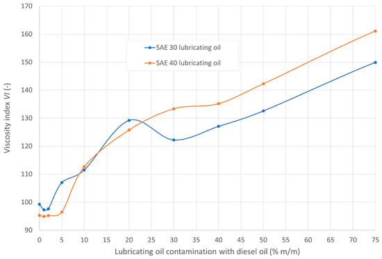 The confirmation of the lack of a visible functional relationship between the obtained CCI values and the diesel oil content in the tested mixtures with lubricating oils arose due to the large discrepancies in the values of Pearson’s correlation coefficient for these variables, namely, rXY = 0.694 for the mixtures of lubricating oil of viscosity grade SAE 30 and rXY = −0.322 for SAE 40.