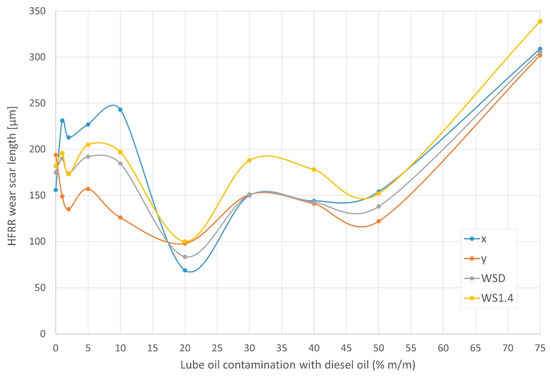 To clarify the nature of the changes in the lubricity of the lubricating oil with the dilution of the lubricating oil with diesel oil, as indicated in [16], this article presents a greater number of measurements, providing and analyzing lubricity test results for mixtures over a wide range of diesel oil concentrations, namely, 0%, 1%, 2%, 5%, 10%, 20%, 30%, 40%, 50%, 75%, and 100% m/m of diesel oil. In addition to the WSD lubricity, the corrected WS1.4 lubricity and the baseline wear values in two orthogonal wear directions (i.e., x and y) were provided to obtain a complete picture of lubricity. Additionally, in the full range of concentrations, the relative percentage film thickness (FILM) and the average friction coefficient μ during HFFR tests were determined.