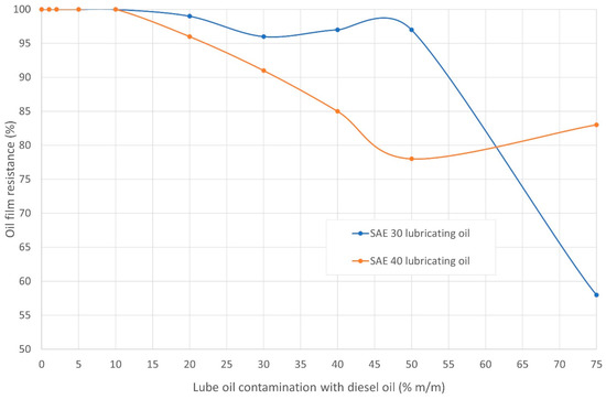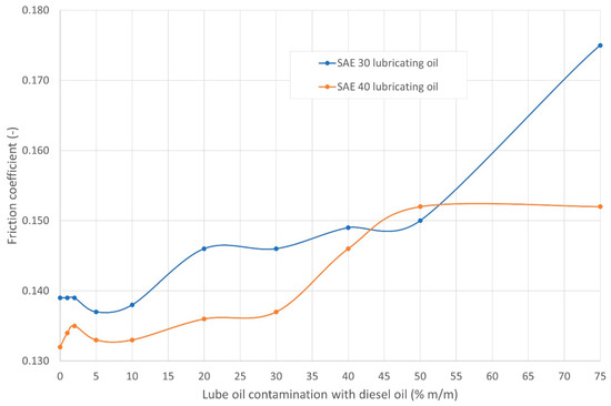 The determined results did not show a clear relationship with the lubricity. However, they indicated changes in the value of additional parameters. Nevertheless, these values for the coefficient of friction showed a significant increase at diesel oil concentrations above 10% m/m, and then decreased at high diesel oil concentrations (pure diesel oil). On the other hand, the FILM parameter for the tested SAE 30 oil with contamination above 10% m/m of diesel oil in lubricating oil decreased in the entire concentration range, while it initially decreased and then increased its value for SAE 40 oil. Nevertheless, for both the tested oils, when the diesel oil concentration was exceeded by 10% m/m, the value of the FILM parameter did not reach the values obtained for the diesel oil concentrations not higher than 10%.