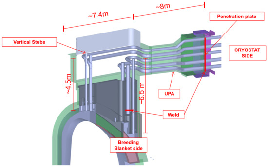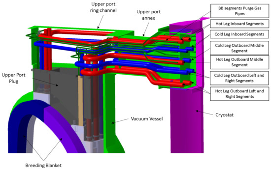 Their layout must allow for access to each pipe by the remote handling tools [19,20]. Hence, space is required between the pipes at the levels of the cut and re-welding areas. To date, pipes with diameters of up to 90 mm have been cut and rewelded, trials have been run, and cutting tools have achieved cuts from inside pipes through 5 mm 316 L and P91 (substitute for Eurofer 97) [21]. It is clear that a remote maintenance strategy coupled with proper test campaigns is needed to develop technologies that guarantee the cutting and welding of pipes much larger in their diameters and thicknesses. The layout of these pipes must also consider the required space for the BB attachment interfaces for their replacement and manipulation [22]. The pipes are assumed to not be insulated inside the upper port, since they are in a vacuum, while insulated on the outside of the penetration plate. The vertical legs of the pipes are equipped with vertical stubs on the top (Figure 1). These will be opened during maintenance and will allow for the insertion of in-bore pipe tools [21].
