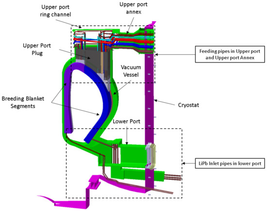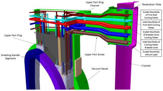According to the proposed layout, ten in-port manifolds are placed in the UPRC and UPA, as reported in (Figure 4), eight of which are dedicated to the FW and BZ cooling water and two for the LiPb outlet leg.