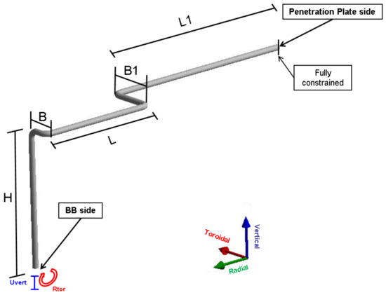 The following boundary conditions were considered in the FEM analyses: (i) the operating pressure of the coolant; (ii) the pipe operating temperature; and (iii) the BB segment deformation and consequent movement of the pipe interface (location “BB side”-Figure 6), i.e., the vertical displacement and rotation about the toroidal axis.