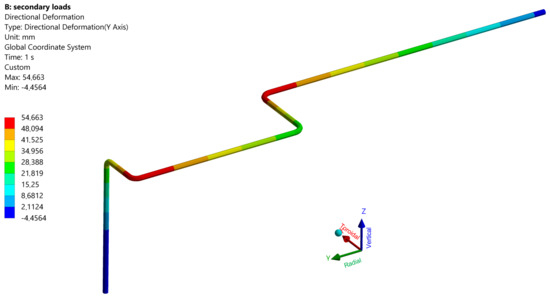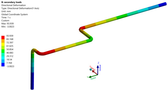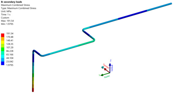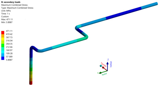 Figure 9 and Figure 10 show the secondary stress and radial deformation in the load case “5”, see Table 4, which is a representative load case for WCLL feeding pipes. If the design pressure was 178 bar and the temperature was near to 300 °C, the level of secondary stress was quite below the limit imposed by the code, which was mainly due to the reduced diameter and thickness of the pipe and thus to the increased flexibility of the pipe itself. Additionally, in this case, the higher value of stress was at the level of the BB back plate, and the maximum radial was about 55 mm at the level of the two horizontal elbows.