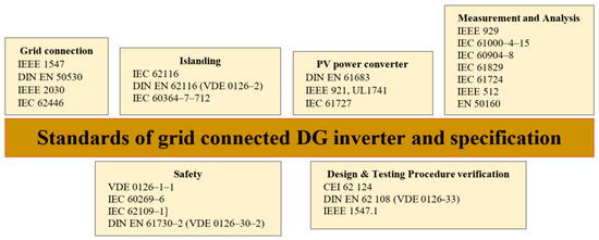 These standards are established by various commissions primarily to enhance safety and quality factors, address islanding issues, and address electromagnetics. The most relevant international organizations in this regard include the IEEE in the United States (Institute of Electrical and Electronics Engineers), the IEC in Switzerland (International Electrotechnical Commission), and the DIN and VDE (DKE) in Germany (German Commission for Electrical, Electronic, and Information Technologies). Figure 7 showcases the widely used standards and their specifications for grid-connected DG systems [135,136,137].