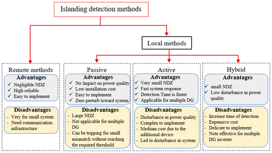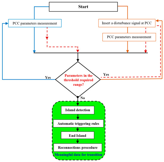 According to IEEE 1547 of 2008, an “island into the electric power system” is defined as “a condition in which a part of the system comprising the DGs system and local load is isolated from the rest of the electric grid under a grid failure or loss at the PCC. Furthermore, this island acts as a local production resource and continues to supply power to local loads” [123]. Islanding can typically be intentional or unintentional (unplanned). Intentional islanding is planned in advance and occurs during maintenance operations. Numerous publications have raised concerns about unplanned islands. In fact, multiple factors could lead to unintentional islanding, including [123,124,125,126]: