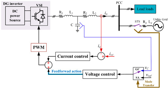 In the GC mode, the amplitude and frequency of the output inverter voltage are fixed by the main grid. Under fault conditions, DG units and local loads are isolated from the rest of the grid and need to operate in SA mode. In islanded MG, i.e., SA mode, the inverter control system is responsible for regulating the voltage characteristics (frequency and amplitude) [26,27,28,29]. Nevertheless, between GC and SA, there is a short period of time where the bus voltage is neither regulated by the inverter controller nor fixed by the main grid, which may result in a decrease in power quality and load malfunction [8,9,22,23,26]. This situation may result in abrupt changes in system state variables, which can affect the whole system [22,30].