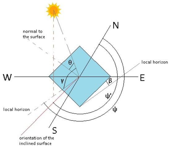 Figure 2 shows a schematic of solar rays incident on a tilted surface. The tilted surface was deliberately not aligned with the direction of the sun; this was done to show the various angles formed (the tilt angle of the inclined surface, β, the solar altitude, γ, the incidence angle, θ (the angle between the normal to the sloping surface and the direction toward the sun), the solar azimuth, ψ, and the azimuth of the sloping plane, ψ′.