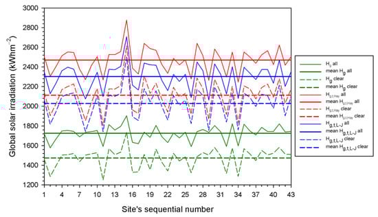 The intra-annual variations in Hg,t,Hay/ρg for the 43 sites are shown in Figure 6, The curves for almost all sites are remarkably close to each other, creating a bundle (zone) under all- (Figure 6a) and clear- (Figure 6b) sky conditions. The amplitude of this band (i.e., dispersion of the monthly mean values) is ≈150 Wm−2 in both cases. This can be confirmed by the comparable standard deviations in the average Hg,t,Hay/ρg values for all- (127 Wm−2) and clear- (157 Wm−2) sky conditions (third line from bottom in Table 2).