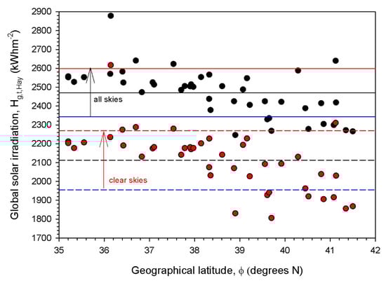 From Figure 3, one can see that Hg,t,L-J varies between 2064 kWhm−2 and 2709 kWhm−2 [(average) 2298 kWhm−2 ± (1σ) 133 kWhm−2 = 2165 kWhm−2 to 2431 kWhm−2] for all skies and between 1743 kWhm−2 and 2502 kWhm−2 [(average) 2023 kWhm−2 ± (1σ) 154 kWhm−2 = 1869 kWhm−2 to 2177 kWhm−2] for clear skies (σ = standard deviation); these values become for Hg,t,Hay 2247 kWhm−2 to 2878 kWhm−2 [(average) 2471 kWhm−2 ± (1σ) 127 kWhm−2 = 2344 kWhm−2 to 2598 kWhm−2, all skies] and 1806 kWhm−2 to 2617 kWhm−2 [(average) 2113 kWhm−2 ± (1σ) 156 kWhm−2 = 1956 kWhm−2 to 2269 kWhm−2, clear skies]. Figure 4 shows the above Hay-modeled findings in diagrammatic form. It can be seen that the standard-deviation band is narrower under all skies rather than clear ones, that is, higher dispersion of the clear-sky Hg,t,Hay values than the all-sky ones exists. This may be attributed to the selection process of the Hg,t,Hay values that fall in the clear-sky zone (i.e., 0.65 < k′t ≤ 1, Equation (11)); any criterion such as k′t cannot ensure 100% accuracy that the selected values of the variable will fully obey the criterion, but there may be other values of the variable that will falsely be classified in the clear-sky zone. Another observation from the graph in Figure 4 is that the solar irradiation values that lie outside the ±1σ band occur at higher latitudes, that is, for φ > 39° N. This finding may be attributed to the higher weather variability in the northern part of Greece than in the southern part, particularly under clear skies. More specifically, under all-sky conditions, seven (or 16.3%) Hg,t,Hay data points lie outside the ±1σ band for φ < 39° N and 8 (18.6%) for φ > 39° N, while under clear-sky conditions, only four (9.3%) Hg,t,Hay data points lie outside the ±1σ band for φ < 39° N and 9 (20.9%) for φ > 39° N.