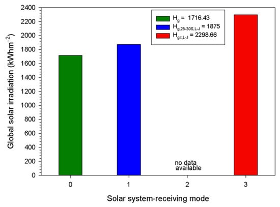Nowadays, the use of static solar systems is widespread in solar energy applications worldwide because of their simple structure and low maintenance costs. For this reason, these systems have received great attention from researchers (c.f., solar energy potential, solar availability, e.g., [,]). Another study reported that dynamic mode-II solar systems have a relatively higher solar energy imprint []. Dynamic mode-III solar systems have been used for roughly the last 25 years because they provide a higher performance in comparison to that of mode-I and mode-II solar systems [,]. Much effort has been invested, however, in the improvement of both the mechanical and electronic parts of the sun-tracking apparatus and sensors, respectively [,], which are involved in the configuration of dynamic solar systems. Nevertheless, the solar energy received by such systems must always be evaluated against solar radiation measurements []. However, the shortage of solar radiation measuring stations worldwide has initiated the development of solar radiation models [,,,]. Such models are capable of deriving the optimum tilt angle and orientation of flat-plate solar panels mounted on static systems for obtaining maximum solar energy. Except modeling alone, there exist other methods that combine ground-based solar data and modeling [], or that utilize solar radiation data from international platforms [,].