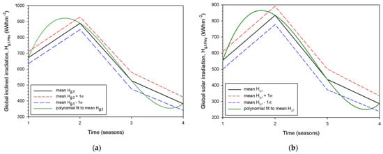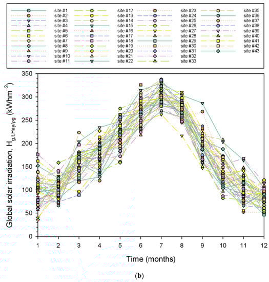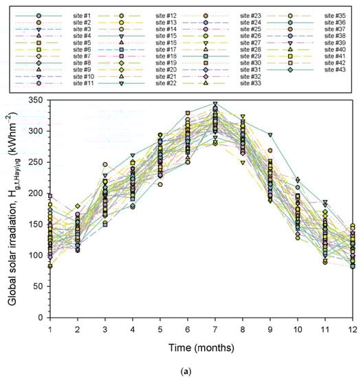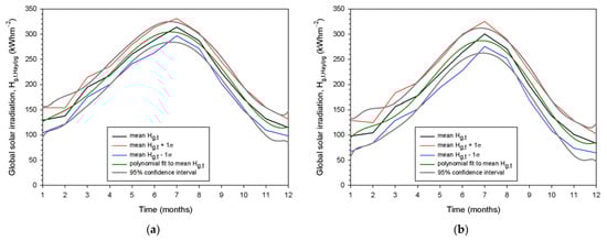 From Figure 6, information about the solar energy sum per site and month can be extracted. Nevertheless, this visual task may not be satisfactory for solar energy engineers and investors/entrepreneurs because they would be happy to have a guide that would provide them with a more precise estimate of the monthly solar energy. In this context, the monthly energy yields averaged over all sites and in their TMYs were estimated; Figure 7 shows their average intra-annual variation for all of Greece. The graphs also show the ±1σ curves around the mean curves and the polynomial curves that fit the mean curves. It is easy to see that both mean and polynomial fit curves lie within the ±1σ band; this implies that there are no abnormal (outliers) monthly values that would result in drifting of the mean and/or the fitted lines outside the ±1σ bands in all or certain months. Moreover, the peak Hg,t,Hay/ρg values occurred in July (Figure 6 and Figure 7), as anticipated. This is because Greece is a country not close to the equator; on the contrary, countries closer to the equator provide a different intra-annual solar energy potential with higher values in spring and autumn than in summer, for example [], which is due to solar paths (solar analemmas [,]) over such locations year-round. Figure 7 shows the curves that best fit the mean ones in the form of sixth-order polynomials; their regression expressions are shown in Table 3. This order of polynomials was selected to provide the highest R2.