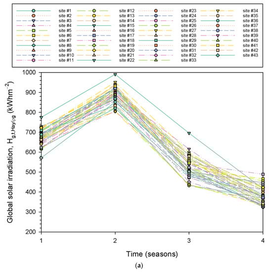 Similar to the presentation of the intra-annual (i.e., monthly) variation in the Hg,t,Hay/ρg levels (cf. Figure 6), Figure 8 presents the seasonal solar energy potential across all sites in Greece. As expected, the solar energy potential peaks during summer for all sites. Exceptionally higher Hg,t,Hay/ρg levels occur at the Kastellorizo site (site #15 on the map of Greece in Figure 1, a site at the southeastern corner of the country). The high annual solar energy potential of Kastellorizo is depicted in Figure 4 (black and red dots at φ = 36.14° N), and in Table 2 (site #15).