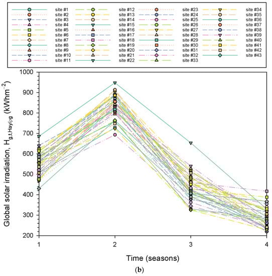 Seasonal mean Hg,t,Hay/ρg variation under (a) all- and (b) clear-sky conditions for all 43 sites in Greece. The seasonal values are sums of the hourly irradiance ones for each site. The site numbers in the legend (i.e., site #) correspond to those solar radiation ones for each site. Numbers 1 to 4 on the x-axis indicate seasons (1 = spring to 4 = winter).