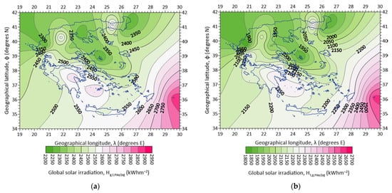 Figure 10 shows the solar energy potential over Greece with respect to the annual Hg,t,Hay/ρg yields. A gradual increase is observed in the annual solar energy potential in the direction N-S for both all- (Figure 10a) and clear- (Figure 10b) sky conditions. Such a trend was found for the solar horizontal irradiances in Greece (see Figure 10b in []), as well as for the solar radiation received on flat-plate collectors tilted to the south at 25°–30° (see Figure 11a in []). From Figure 10a,b of the present work, one can easily realize that, in both cases, an (imaginary) horizontal line at φ ≈ 39° N divides the country into a northern part with lower solar energy availability and a southern one with higher Hg,t,Hay/ρg levels. This was confirmed by a study of the solar radiation climate of Greece [], in which the dividing line was also placed at φ = 39° N. Amazingly, the Hg,t,Hay/ρg patterns in Figure 10a,b are almost identical. The remarkable similarity may be attributed to two factors. (i) Latitude: at higher latitudes, lower solar radiation levels are received by a horizontal plane on the surface of the earth and consequently on inclined flat-plate surfaces. (ii) Meteorology: more frequent cloudiness occurs in the northern part of the country; indeed, a relevant study for the cloudiness over the Mediterranean region shows a similar pattern over Greece on an annual basis to that in our Figure 10a (cf. Figure 1i in []).
