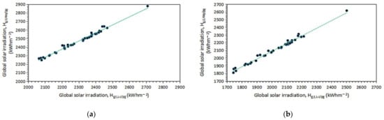 - Various researchers [,,,] have shown that the PVGIS tool simulates values for a solar horizontal radiation with an accuracy between −14% and +11% (a median value of −1.5% is, therefore, very comparable to the ±3% accuracy of most pyranometers). This was done by comparing the PVGIS-simulated solar radiation values with real measurements. Thus, no new evaluation was required for the PVGIS tool. As far as the interdependence of the Hg,t,Hay/ρg- and Hg,t,L-J/ρg-estimated values is concerned, this is shown in Figure 11a for all- and Figure 11b for clear-sky conditions. In both cases, the interdependence is linear, as anticipated.