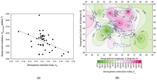 - Figure 12a shows the dependence of Hg,t,Hay/ρg on ke. A linear fit to the data points was derived with a negative slope, which implies decreasing solar irradiation values with an increasing atmospheric extinction index. In other words, a 0.1 increase in ke results in an almost 1273 kWhm−2 decrease in Hg,t,Hay/ρg (calculated by applying the linear expression in Figure 12a twice for ke1 = 0.38 and ke2 = 0.48, computing the Hg,t,Hay/ρg1 and Hg,t,Hay/ρg2 values, and taking their difference (Hg,t,Hay/ρg2 − Hg,t,Hay/ρg1). As these energy values concern the entire Greek territory (i.e., the average value for all 43 sites), then a decrease of about 30 kWhm−2 (=1273/43) per site in a year-round is calculated or a decrease of ≈2.5 kWhm−2 (=30/12) per site and per month. From Figure 7a, one sees that the average energy yield for January (worst case) is about 130 kWhm−2 for all 43 sites or about 3.0 kWhm−2 (=130/43) per site, and 330 kWhm−2 in July (best case) for all 43 sites or 7.8 kWhm−2 (=330/43) per site. The site-month values of 3.0 (or 7.8) kWhm−2 are comparable to (or 3 times higher than) the 2.5 kWhm−2 decrease in Hg,t,Hay/ρg due to a 0.1 increase in ke. Since ke = Hd/Hb (consider Hb = constant), a 0.1 increase in ke means a 10% increase in Hd and a subsequent decrease in Hg,t,Hay/ρg equal to 1273 kWhm−2 (or 14% equivalently). Therefore, any solar energy investor in Greece should consult not only the solar energy potential map of Greece (Figure 10a) but also the corresponding map of ke in Figure 12b. In the latter map, higher ke values occur over the northern Aegean Sea, Macedonia, and Thrace regions and lower ones over Peloponnese, Crete, and Rhodes. Considering that a constant Hb value indicates that favorable areas for solar harvesting in Greece are those of Peloponnese, Crete, and Rhodes because the contribution of the diffuse solar component is less important than in the northern areas, no extra cost in the solar panel material is anticipated to exploit the higher diffuse radiation in northern Greece with respect to the Hb component.