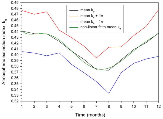 The atmospheric extinction index, ke, was also used in the present study introduced by []. This index provides information about the contribution of the diffuse and direct solar radiation components to solar harvesting. A plot of the annual mean Hg,t,Hay/ρg values versus ke showed a declining trend. Therefore, a map with annual mean ke values over Greece under all-sky conditions revealed an almost opposite pattern to that for Hg,t,Hay/ρg. Moreover, the intra-annual variation in the monthly mean ke values was established. Seasonal maps for the atmospheric extinction index over Greece were derived. A best-fit curve was produced for the intra-annual variation. The seasonal ke maps showed patterns quite opposite to those for Hg,t,Hay/ρg, at least for spring and summer.