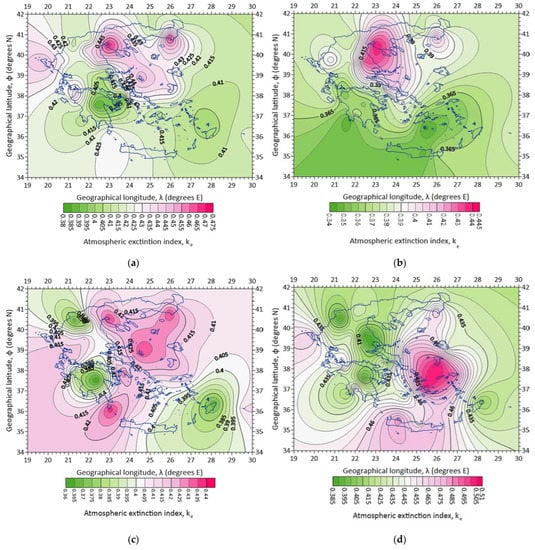 Figure 14. Maps of the atmospheric extinction index, ke, over Greece under all-sky conditions for (a) spring, (b) summer, (c) autumn, and (d) winter. The ke values are the seasonal averages of the TMYs. The kriging geospatial interpolation method was used to draw isolines from the available 43 values. - (iv)
