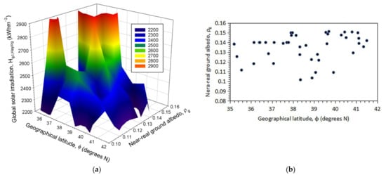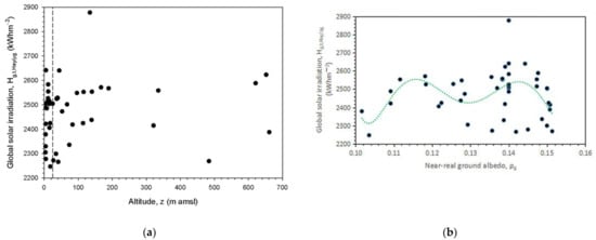 - The variations in the annual Hg,t,Hay/ρg values versus φ were presented in Figure 4. Here, analogous plots were derived with respect to z and ρg. The variation in the annual Hg,t,Hay/ρg values versus z is shown in Figure 15a, while the variation in Hg,t,Hay/ρg versus ρg is shown in Figure 15b. In both figures, a wide dispersion of the Hg,t,Hay values versus z or ρg is observed; moreover, many Hg,t,Hay values occur at lower elevations (below 25 m amsl, vertical dashed line in Figure 15a), which shows that the global solar irradiation is not strictly related to the altitude of the site (at least in the range of 0–700 m amsl). Indeed, 16 of 43 sites (37.2%) are at altitudes lower than 25 m amsl. A similar conclusion is drawn from Figure 15b; here, the sixth-order polynomial fit is shown to form two peaks at ρg ≈ 0.116 and ≈ 0.144. The very loose dependence of solar irradiation (for flat-plate solar panels fixed on dual-axis systems in Greece) either on the site location (i.e., geographical latitude) or the type of ground (i.e., ground albedo) concludes that the general rule for solar energy system installation is only the region (northern or southern Greece, see Figure 10 and Figure 16).