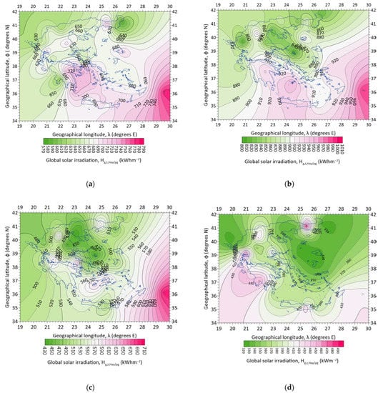 Figure 16. Maps of the global solar irradiation, Hg,t,Hay/ρg, over Greece under all-sky conditions, for (a) spring, (b) summer, (c) autumn, and (d) winter. All values are seasonal averages of the TMYs. The kriging geospatial interpolation method was used to draw isolines from the available 43 values. - (v)