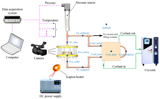 A schematic diagram of the experimental system is shown in Figure 2. The heat load was applied to the evaporator by an annular Kapton heater (Φ56/10 mm) and its output power was controlled by a DC power supply (PSW 160-21.6, GW Instek, Taiwan, China). To reduce the heat leak to the environment, the Kapton heater was covered with aerogel felt, which was held in place with the help of a stainless steel plate. The condenser plate was cooled by an aluminum cold plate and the contact surface was filled with thermal grease to reduce the contact thermal resistance. The coolant for the cold plate was water at a temperature of 5 ± 0.1 °C, which was provided and circulated by a cryostat.