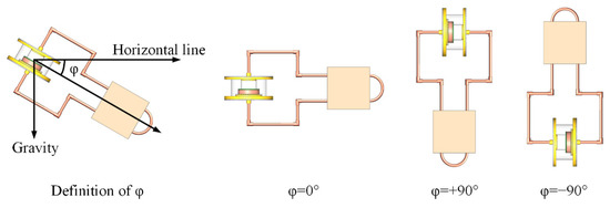 The FLHP orientations studied in this paper are illustrated in Figure 3. In this work, the orientation in which the condenser and the evaporator–CC assembly were situated at the same height was selected as the reference orientation, i.e., φ = 0°, which was a general choice in the literature [15,19]. When the FLHP was placed at an orientation of φ = 0°, the liquid line would be located above the vapor line, which could induce some gravity head. However, compared with the capillary force provided by the wick, the induced gravity head was relatively small and an orientation of φ = 0° still could be considered a reference orientation. Based on the definition of the reference orientation and the coordinate, in the cases of φ = −90° and +90°, the positions of the condenser were above and below the evaporator–CC assembly, respectively. It should be noted that for the FLHP studied in this paper (flat evaporator with opposite replenishment), the liquid supply crisis should be avoided so that the CC should not be positioned approximately vertically below the evaporation area of the evaporator.