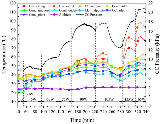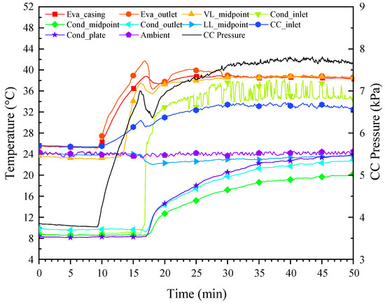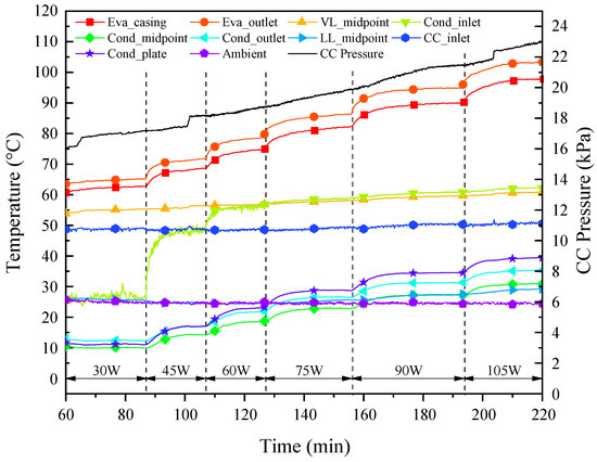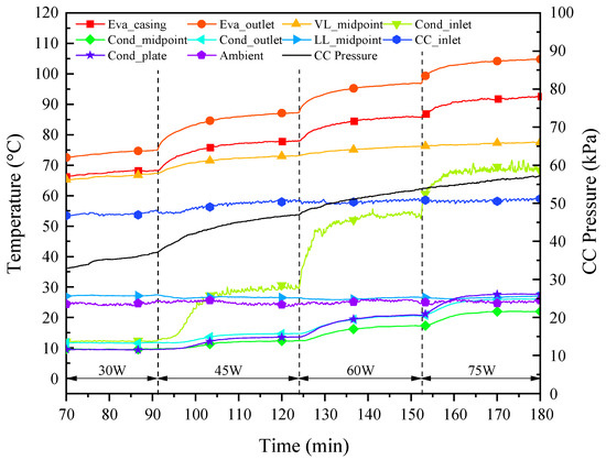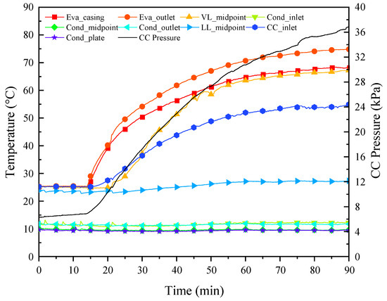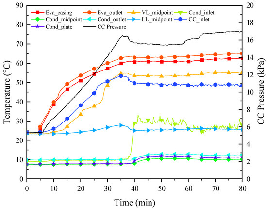 With the passage of heating time, the temperature of the vapor line increased gradually in the vapor flow direction. After the heat load was applied for about 8 min, the rise in temperature at the midpoint of the vapor line was monitored; for about 33 min, the temperature at the condenser inlet rose sharply, meaning that the vapor had arrived near the condenser. As the working fluid circulation was established, the liquid with a low temperature flowed into the CC, resulting in a mild decrease in the CC temperature and, therefore, the pressure.