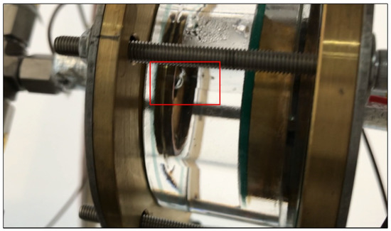 Based on the flow path described in Figure 11, there should have been a returning liquid flow at the inlet of the CC when the operation of the FLHP was in gravity-driven mode. However, the visual observation showed that there was no return liquid when the heat load was no more than 105 W, as shown in Figure 12, for example.