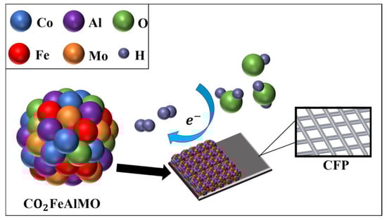 Hydrogen is a promising energy vector used in many electrochemical processes because of its advantages of high energy density and being environmentally benign. This gas is not naturally available, and technological strategies have been developed to generate it efficiently without using harmful substances. Non-precious metals have mainly been studied for their potential as electrocatalysts for the H2 evolution reaction in the green electrochemical water splitting process [54]. This hot topic is considered a sustainable alternative due to the low cost and abundance of these elements. Nevertheless, precious metal-free electrocatalysts suffer from slow kinetics and de-activation under the operational conditions of electrolyzers. In this context, many authors have proposed that the implementation of composites based on Ni, Cu, Co, and Fe are a short distance from commercial application. Conventional single-principal-element alloys suffer from insufficient water-splitting activity, so many efforts have been made to design multimetallic catalysts. For instance, the Shi research group proposes the implementation of Mo(NiFeCo)4/Ni) as a hierarchical nickel network of electrocatalysts for water splitting [55]. In recent work, Zhang et al. demonstrated the versatility of a high-valence Co2FeAlMo1.5 alloy for HERs in alkaline media [56]. This compound was easily synthesized by the coprecipitation method in the presence of polyvinyl pyrrolidone and ammonia. The obtained powder was thermally treated at 750 °C for 10 h in a mixed gas atmosphere of H2 and Ar at 5% and 95 %, respectively. The electrochemical results suggest that a synergistic effect of the alloy promotes HER due to the optimized crystal and electronic structure of this thermally treated alloy. Linear sweep voltammetry measurements in 1 mol L−1 KOH show that this material has outstanding characteristics regarding its low overpotential, 71 mV at 10 mA cm−2. The kinetic parameters and the stability were improved, showing a shift by 2 mV after 1000 cycles. Thus, it can be deduced that the intrinsic electrochemical activity of non-precious metals can be tuned by alloying them with high-valence and stable ones. The latter produces vacancies, dislocation, and interstitial sites that generate active sites and then improve the electrochemical activity of this material. Figure 2 illustrates the structure of Co2FeAlMox supported on carbon fiber paper and its interaction with H2O species to successfully achieve the electrochemical water splitting.
