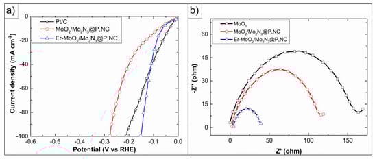Tan et al. reported a co-doped MoO2/Mo2N3 heterostructure incorporating erbium [60]. The latter leads to a change in electron density distribution that modifies the Gibbs free energy of intermediates, improving the HER. Figure 3 presents the electrochemical response of these materials. From Figure 3a, it can be observed that the sample Er-MoO2/Mo2N3@P,NC surpasses the performance of the Pt/C material at high current densities and the EIS measurements. Figure 3b reveals that the improvement of the proposed composite is due to its low charge transfer resistance, as can be inferred from the small semicircle diameter.